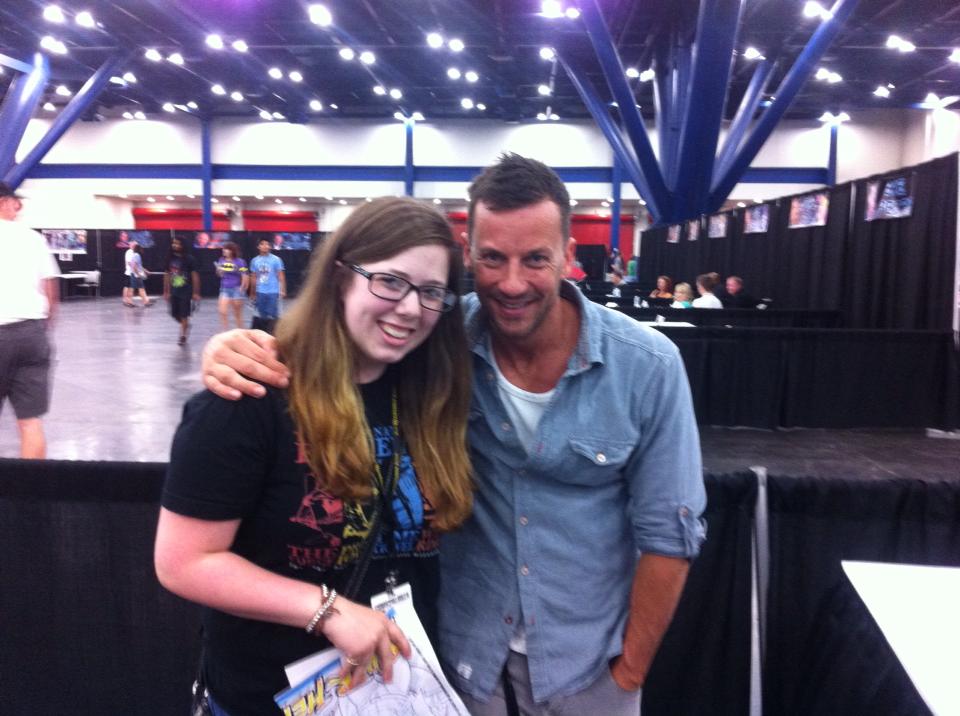 “Manu Bennet had become one of my favorite actors, and I didn’t know what to expect upon meeting him”, she said. “ When I first met him on the convention floor, I asked him if I could have a hug. With an exuberant ‘of course, darling!’ he gave me a big hug. We talked a bit about his role as Crixus in Spartacus, and he was very down to earth and pleasant.”