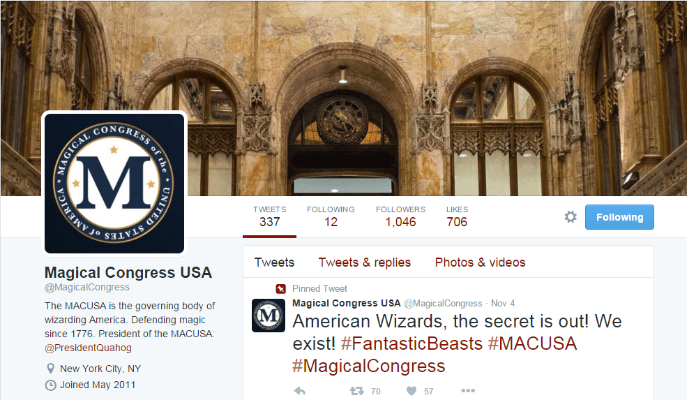 The Magical Congress of the United States (MACUSA) Twitter page has been tweeting about all things wizardry since March of 2013, and the page was created way back in 2011!